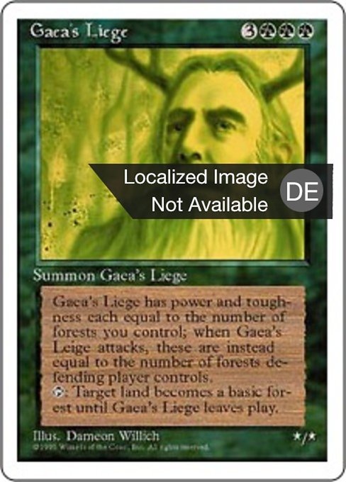 ![]() Variations— Parts— | Gaea's Liege* / * As long as Gaea's Liege isn't attacking, its power and toughness are each equal to the number of Forests you control. As long as Gaea's Liege is attacking, its power and toughness are each equal to the number of Forests defending player controls.