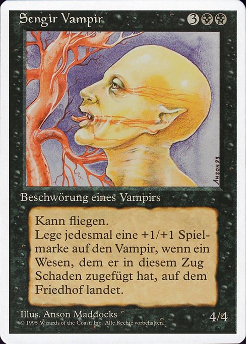![]() Variations— Parts— | Vampire sengien4 / 4 Flying (This creature can't be blocked except by creatures with flying or reach.) Whenever a creature dealt damage by this creature this turn dies, put a +1/+1 counter on this creature.