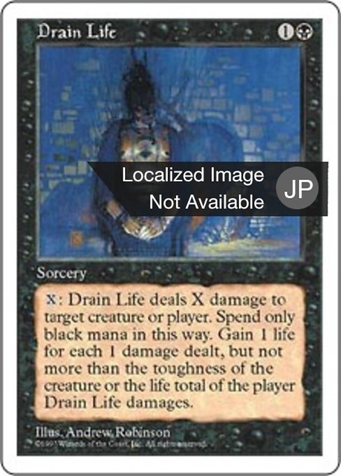 ![]() Variations— Parts— | Drain de vieSpend only black mana on X. Drain Life deals X damage to any target. You gain life equal to the damage dealt, but not more life than the player's life total before the damage was dealt, the planeswalker's loyalty before the damage was dealt, or the creature's toughness.