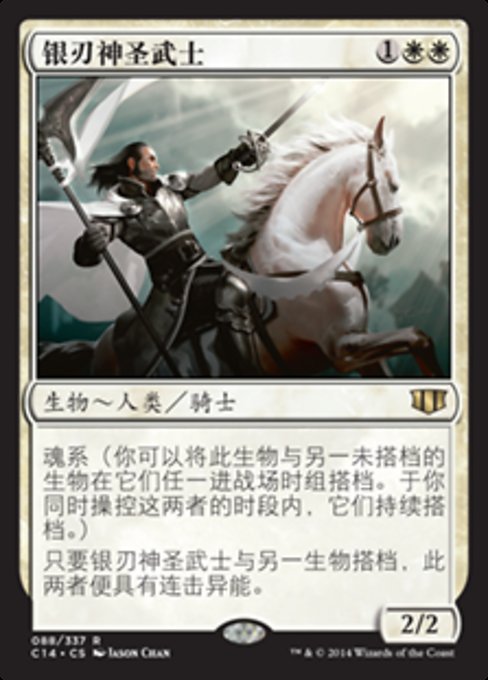 |  Variations— Parts— | 银刃神圣武士2 / 2 魂系 (你可以将此生物与另一未搭档生物在它们任一进战场时组搭档。 只要你操控它们,此两者便持续搭档。) 只要银刃神圣武士与另一生物搭档,此两者便具有连击异能。