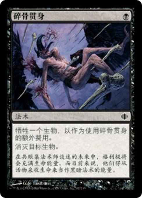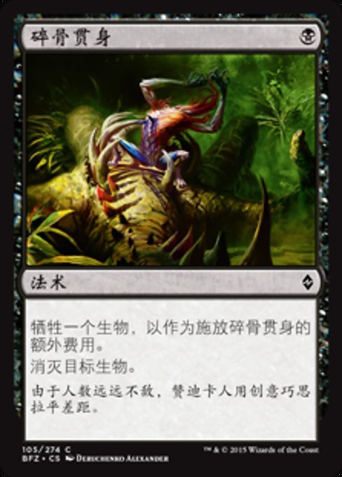 |  Variations— Parts— | 碎骨贯身牺牲一个生物,以作为施放碎骨贯身的额外费用。 消灭目标生物。