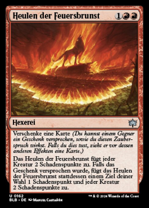 El Aullido incendiario hace 2 puntos de daño a cada criatura. Si ofreciste el regalo, en vez de eso, el Aullido incendiario hace 1 punto de daño a cualquier objetivo y 2 puntos de daño a cada criatura.