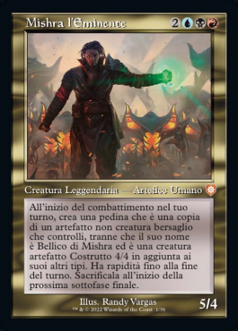 No início do combate no seu turno, crie uma ficha que seja uma cópia do artefato não criatura alvo que você controla, exceto por seu nome ser Guerriforme de Mishra e ela ser uma criatura artefato Constructo 4/4 além de seus outros tipos. Ela ganha ímpeto até o final do turno. Sacrifique-a no início da próxima etapa final.