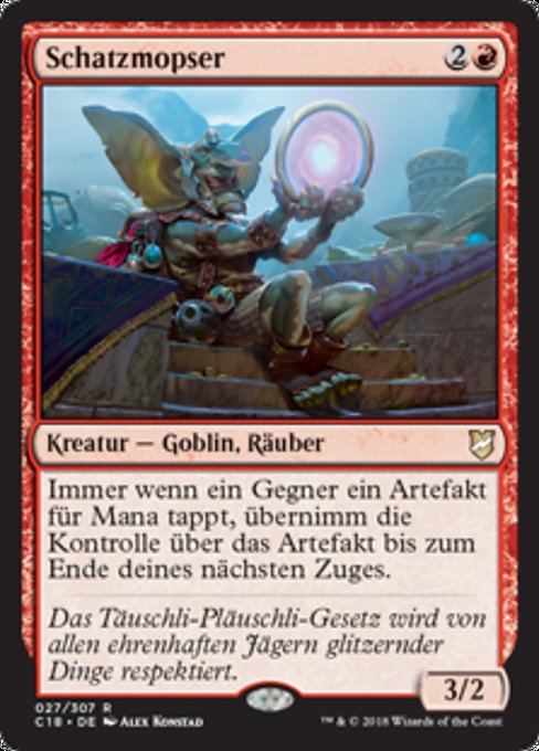 LegalitiesLegal Duel Legacy Vintage Commander Oathbreaker Not Legal Brawl Penny Predh Future Modern Pauper Alchemy Pioneer Historic Standard Timeless Gladiator Oldschool Premodern Standardbrawl Paupercommander RulingsIf multiple players each control Treasure Nabbers, an artifact tapped for mana will make quite a journey. For example, if player A taps an artifact for mana during their turn, and players B and C are the next players in turn order who control Treasure Nabbers, C's ability resolves before B and C gains control of the artifact. Then B gains control of the artifact. B keeps it during their turn, and then C regains control of the artifact once B's effect expires, then A will have it back after C's expires. However, if B or C taps the artifact for mana, one of them will take it from the other. You may need to pay very careful attention to which effects are still in effect, which have expired, and who owns what.