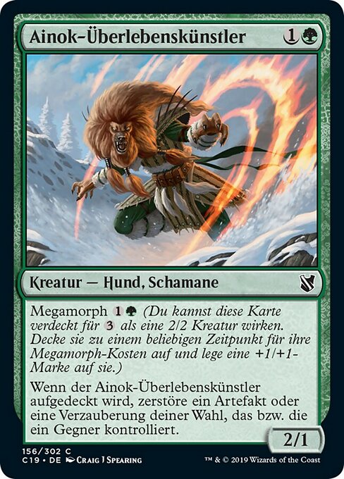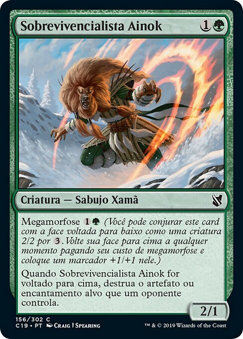 ![]() Variations— Parts— | Survivaliste aïnok2 / 1 Mégamue Quand le Survivaliste aïnok est retourné face visible, détruisez l'artefact ciblé ou l'enchantement ciblé qu'un adversaire contrôle.