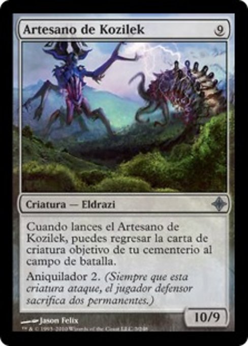 |  Variations— Parts— | Artesano de Kozilek10 / 9 Cuando lances el Artesano de Kozilek, puedes regresar la carta de criatura objetivo de tu cementerio al campo de batalla. Aniquilador 2. (Siempre que esta criatura ataque, el jugador defensor sacrifica dos permanentes.)
