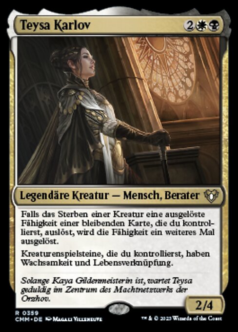 ![]() Variations : 1Parts— | Teysa Karlov2 / 4 Si la muerte de una criatura hace que se dispare una habilidad disparada de un permanente que controlas, esa habilidad se dispara una vez más. Las fichas de criatura que controlas tienen las habilidades de vigilancia y vínculo vital.