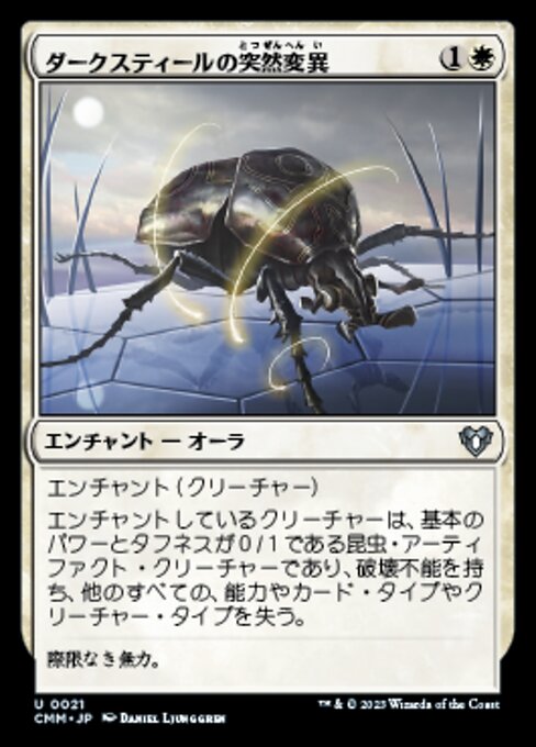 ![]() Variations : 1Parts— | Mutation de sombracierEnchanter : créature La créature enchantée est une créature-artefact Insecte avec une force et une endurance de base de 0/1 et elle a l'indestructible. Elle perd toutes ses autres capacités, ses types de carte et types de créature.