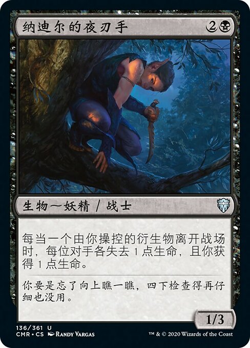 ![]() Variations— Parts— | Lâmina Noturna de Nadier1 / 3 Toda vez que uma ficha que você controla deixa o campo de batalha, cada oponente perde 1 ponto de vida e você ganha 1 ponto de vida.