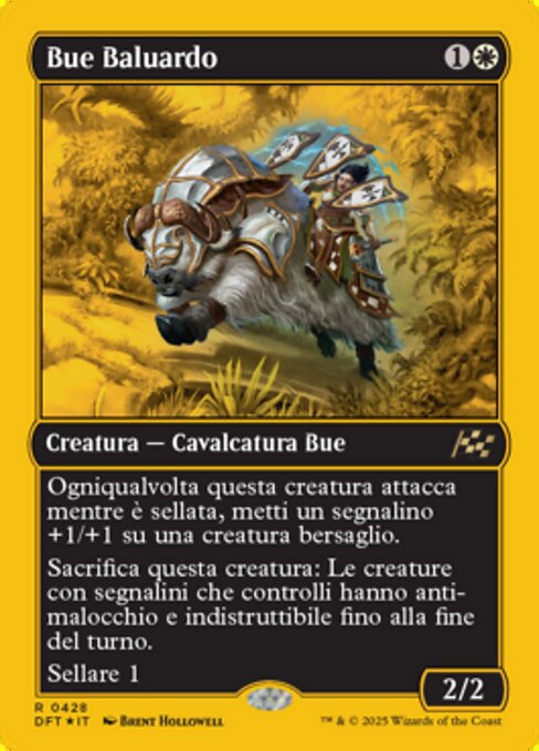 ![]() Variations : 3Parts— | Bulwark Ox2 / 2 Whenever this creature attacks while saddled, put a +1/+1 counter on target creature.Sacrifice this creature +1 counter on target creature. Sacrifice this creature+1 counter on target creature.Sacrifice this creature Creatures you control with counters on them gain hexproof and indestructible until end of turn.Saddle 1 (Tap any number of other creatures you control with total power 1 or more : This Mount becomes saddled until end of turn. Saddle only as a sorcery.)