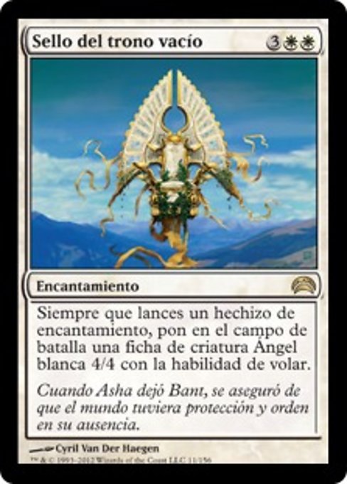 ![]() Variations— Parts— | Sello del trono vacíoSiempre que lances un hechizo de encantamiento, crea una ficha de criatura Ángel blanca 4/4 con la habilidad de volar.