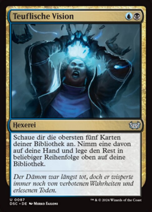 ![]() Variations— Parts— | Visión diabólicaMira las cinco primeras cartas de tu biblioteca. Pon una de ellas en tu mano y el resto en la parte superior de tu biblioteca en cualquier orden.