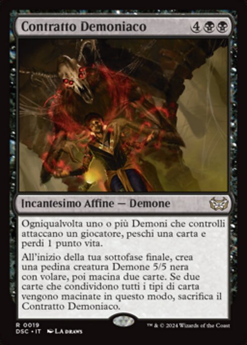 All'inizio della tua sottofase finale, crea una pedina creatura Demone 5/5 nera con volare, poi macina due carte. Se due carte che condividono tutti i tipi di carta vengono macinate in questo modo, sacrifica il Contratto Demoniaco.