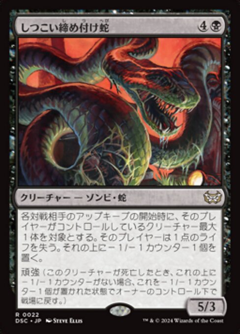 各対戦相手のアップキープの開始時に、そのプレイヤーがコントロールしているクリーチャー最大1体を対象とする。そのプレイヤーは1点のライフを失う。それの上に-1/-1カウンター1個を置く。