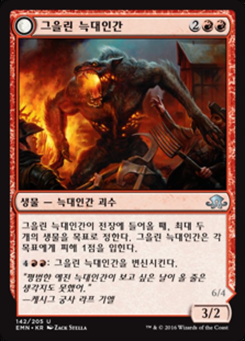 그을린 늑대인간이 전장에 들어올 때, 최대 두 개의 생물을 목표로 정한다. 그을린 늑대인간은 각 목표에게 피해 1점을 입힌다.
