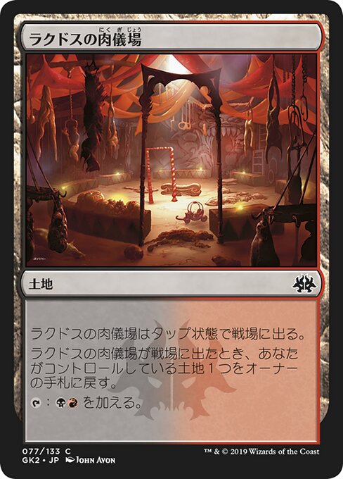 ![]() Variations— Parts— | Carnarium rakdosEl Carnarium rakdos entra al campo de batalla girado. Cuando el Carnarium rakdos entre al campo de batalla, regresa una tierra que controlas a la mano de su propietario.