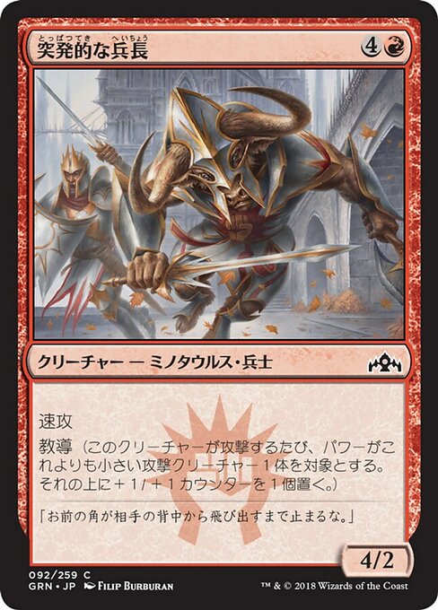 |  Variations— Parts— | Barging Sergeant4 / 2 Haste Mentor (Whenever this creature attacks, put a +1/+1 counter on target attacking creature with lesser power.)