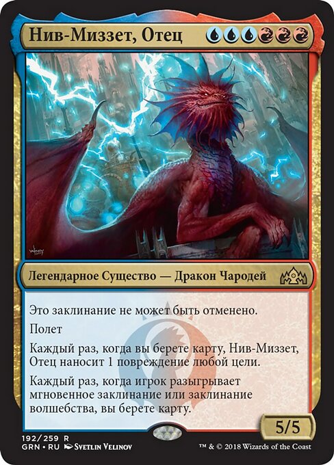![]() Variations— Parts— | Niv-Mizzet, Parun5 / 5 Ce sort ne peut pas être contrecarré. Vol À chaque fois que vous piochez une carte, Niv-Mizzet, Parun inflige 1 blessure à n'importe quelle cible. À chaque fois qu'un joueur lance un sort d'éphémère ou de rituel, vous piochez une carte.