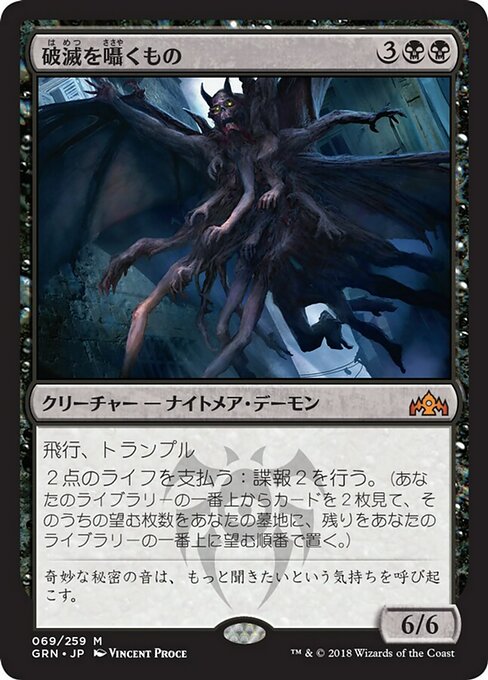 Pague 2 pontos de vida: Use vigiar 2. (Olhe os dois cards do topo de seu grimório. Depois, coloque qualquer número deles em seu cemitério e o restante no topo de seu grimório em qualquer ordem.)