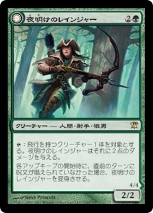 各アップキープの開始時に、直前のターンに呪文が唱えられていなかった場合、夜明けのレインジャーを変身させる。