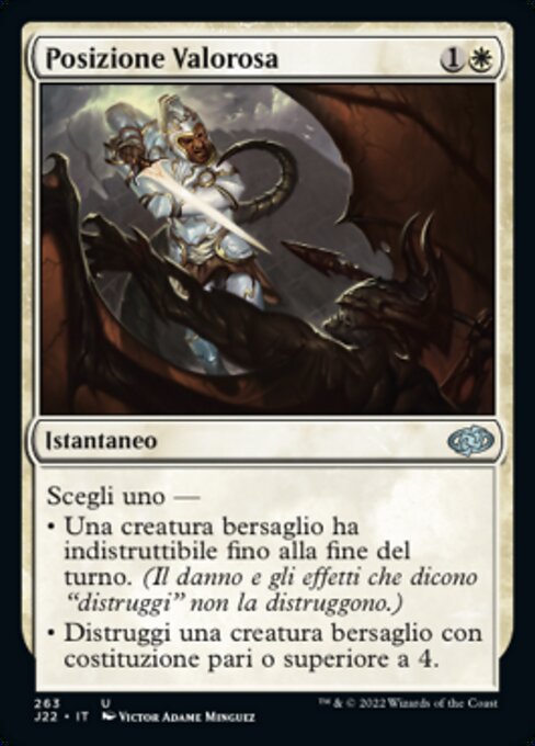 ![]() Variations : 1Parts— | Postura valerosaElige uno: • La criatura objetivo gana la habilidad de indestructible hasta el final del turno. (El daño y los efectos que dicen "destruir" no la destruyen.) • Destruye la criatura objetivo con resistencia de 4 o más.