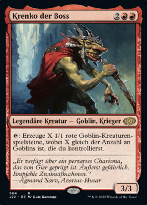 LegalitiesLegal Duel Brawl Penny Future Legacy Modern Alchemy Pioneer Vintage Historic Standard Timeless Commander Gladiator Oathbreaker Standardbrawl Not Legal Predh Pauper Oldschool Premodern Paupercommander RulingsThe ability counts each Goblin you control, including Krenko itself, not just the tokens it creates.