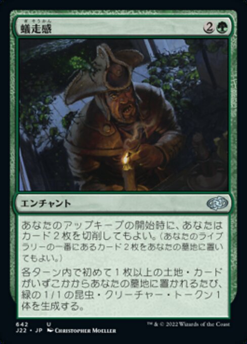 ![]() Variations— Parts— | Sensation rampanteAu début de votre entretien, vous pouvez meuler deux cartes. (Vous pouvez mettre les deux cartes du dessus de votre bibliothèque dans votre cimetière.) À chaque fois qu'au moins une carte de terrain est mise dans votre cimetière d'où qu'elle vienne pour la première fois à chaque tour, créez un jeton de créature 1/1 verte Insecte.