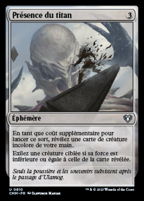 ![]() Variations— Parts— | Présence du titanEn tant que coût supplémentaire pour lancer ce sort, révélez une carte de créature incolore de votre main. Exilez une créature ciblée si sa force est inférieure ou égale à celle de la carte révélée.