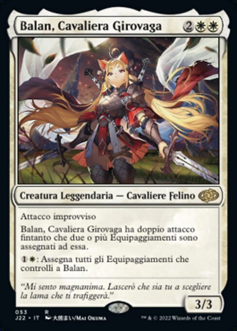![]() Variations— Parts— | 漂浪骑士芭澜3 / 3 先攻 只要漂浪骑士芭澜上贴附有两个或更多武具,它便具有连击异能。