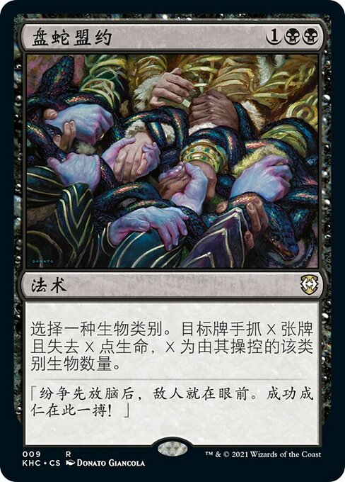 ![]() Variations— Parts— | Pacto de la SerpienteElige un tipo de criatura. El jugador objetivo roba X cartas y pierde X vidas, donde X es la cantidad de criaturas que controla del tipo elegido.