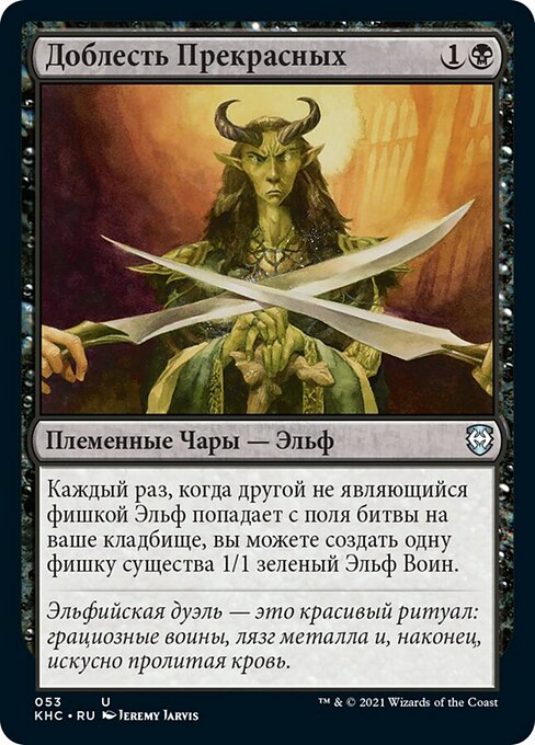 ![]() Variations— Parts— | Proeza do BeloToda vez que outro Elfo não ficha é colocado no seu cemitério vindo do campo de batalha, você pode criar uma ficha de criatura Elfo Guerreiro verde 1/1.