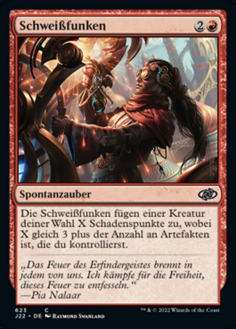 ![]() Variations— Parts— | SchweißfunkenDie Schweißfunken fügen einer Kreatur deiner Wahl X Schadenspunkte zu, wobei X gleich 3 plus der Anzahl an Artefakten, die du kontrollierst, ist.