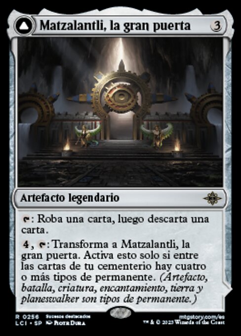 : Transforma a Matzalantli, la gran puerta. Activa esto solo si entre las cartas de tu cementerio hay cuatro o más tipos de permanente. (Artefacto, batalla, criatura, encantamiento, tierra y planeswalker son tipos de permanente.)