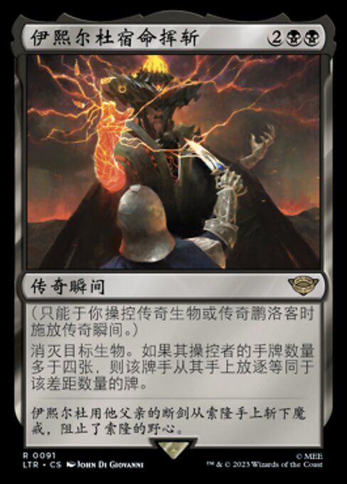 ![]() Variations : 3Parts— | Isildur's Fateful Strike(You may cast a legendary instant only if you control a legendary creature or planeswalker.) Destroy target creature. If its controller has more than four cards in hand, they exile cards from their hand equal to the difference.