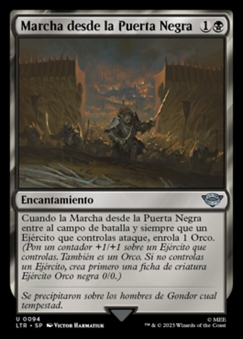 Quand la Marche de la Porte Noire arrive sur le champ de bataille et à chaque fois qu'une armée que vous contrôlez attaque, amassez des orques 1. (Mettez un marqueur +1/+1 sur une armée que vous contrôlez. C'est aussi un orque. Si vous ne contrôlez pas d'armée, créez d'abord un jeton de créature 0/0 noire Orque et Armée.)
