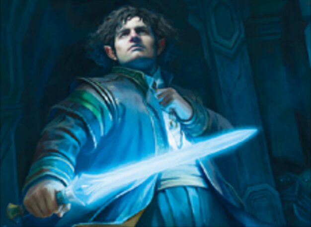 固き決意の英雄、フロドが戦場に出るか攻撃するたび、あなたがコントロールしていてマナ総量が2や3である装備品1つを対象とする。あなたはそれを固き決意の英雄、フロドにつけてもよい。