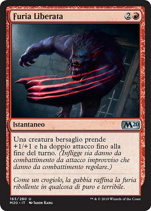 ![]() Variations— Parts— | Furia desatadaLa criatura objetivo obtiene +1/+1 y gana la habilidad de dañar dos veces hasta el final del turno. (Daña primero y también hace daño de combate normal.)