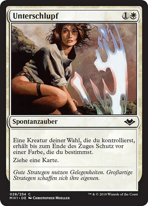 ![]() Variations— Parts— | AbrigoA criatura alvo que você controla ganha proteção contra a cor de sua escolha até o final do turno. Compre um card.