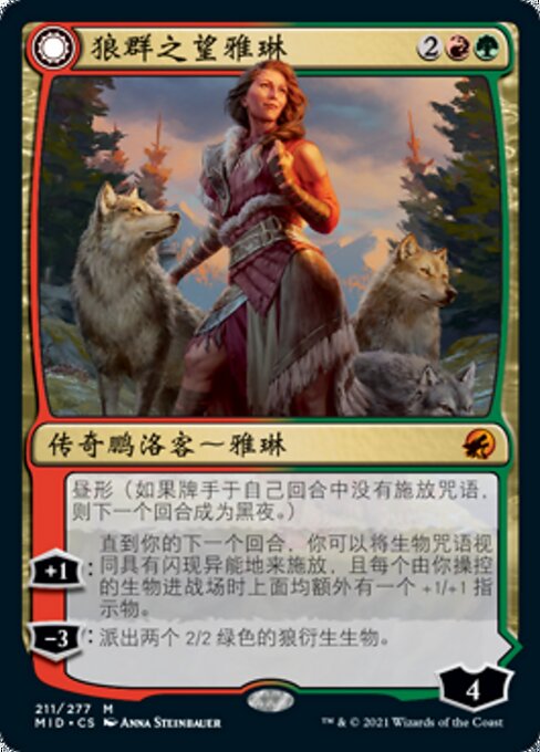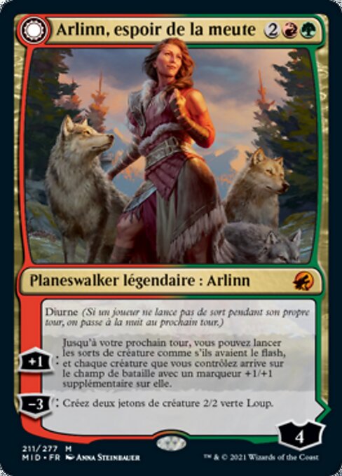 밤 종속 (플레이어가 자신의 턴 동안 주문을 두 개 이상 발동하는 경우, 다음 턴에 낮이 된다.) +2 : 를 추가한다. 0: 턴종료까지, 달의 분노, 아를린은 돌진, 무적 및 신속을 가진 5/5 늑대인간 생물이 된다.