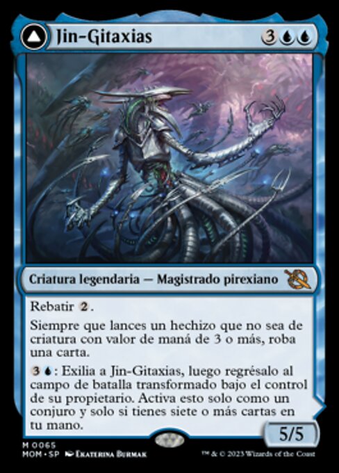 : Exilia a Jin-Gitaxias, luego regrésalo al campo de batalla transformado bajo el control de su propietario. Activa esto solo como un conjuro y solo si tienes siete o más cartas en tu mano.