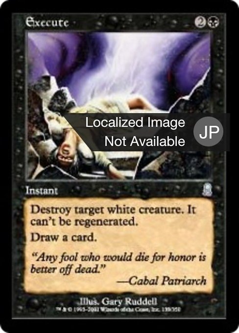 ![]() Variations— Parts— | ExécutionDétruisez la créature blanche ciblée. Elle ne peut pas être régénérée. Piochez une carte.