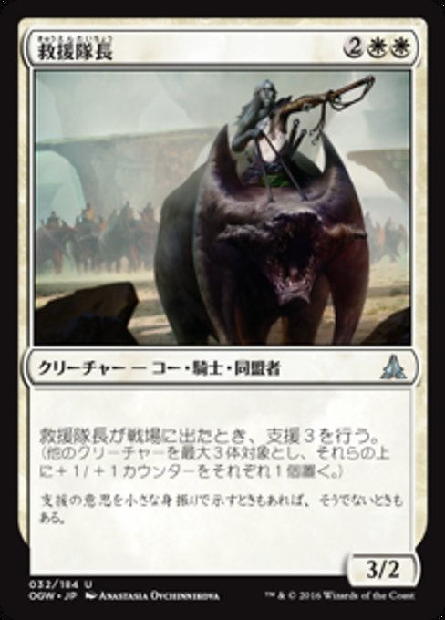 當接防隊長進戰場時,支援3。(在至多三個其他目標生物上各放置一個+1/+1指示物。)