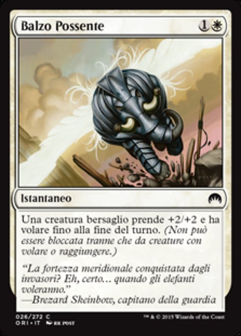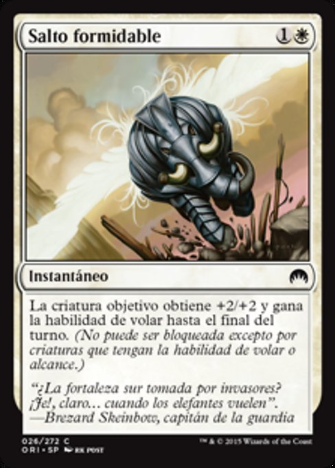 ![]() Variations— Parts— | Mächtiger SprungEine Kreatur deiner Wahl erhält +2/+2 und Flugfähigkeit bis zum Ende des Zuges. (Sie kann außer von fliegenden Kreaturen und Kreaturen mit Reichweite nicht geblockt werden.)