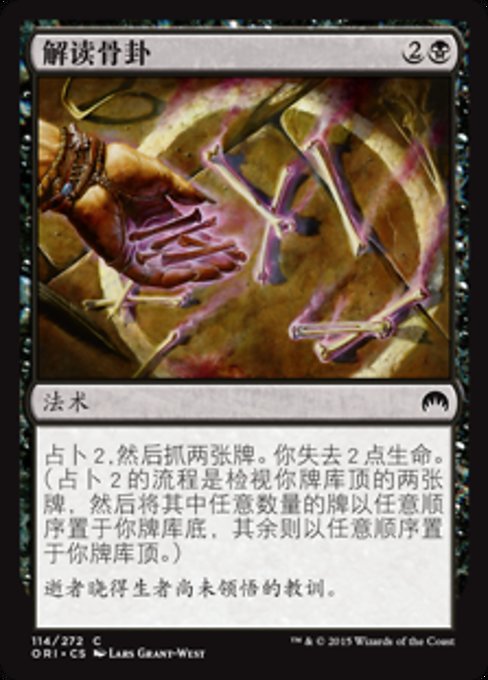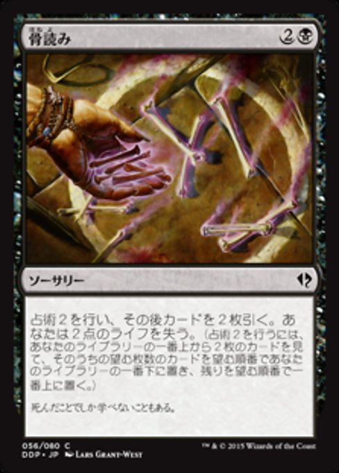 ![]() Variations— Parts— | 骨読み占術2を行い、その後カードを2枚引く。あなたは2点のライフを失う。(占術2を行うには、あなたのライブラリーの一番上から2枚のカードを見て、そのうちの望む枚数のカードを望む順番であなたのライブラリーの一番下に置き、残りを望む順番で一番上に置く。)