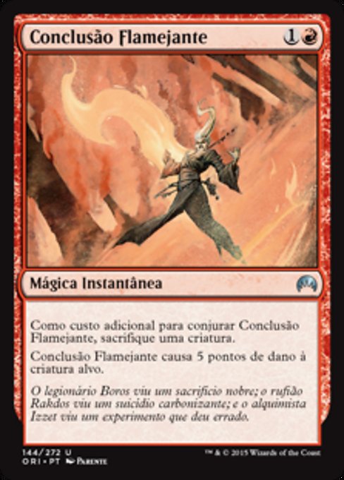 불타는 결말을 발동하기 위한 추가비용으로, 생물 한 개를 희생한다.생물을 목표로 정한다. 불타는 결말은 그 생물에 피해 5점을 입힌다.