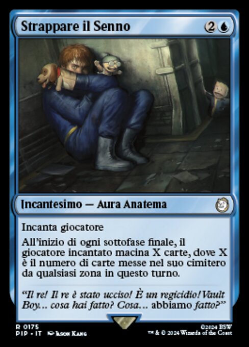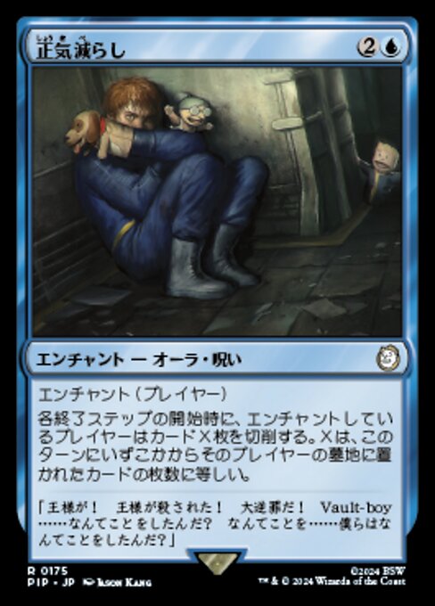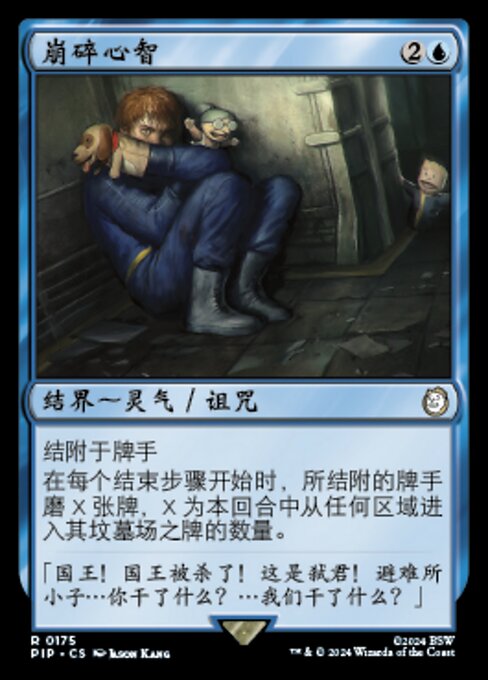 ![]() Variations— Parts— | Zersetzung des VerstandesVerzaubert einen Spieler Zu Beginn jedes Endsegments millt der verzauberte Spieler X Karten, wobei X gleich der Anzahl an Karten ist, die in diesem Zug von irgendwoher auf seinen Friedhof gelegt wurden.