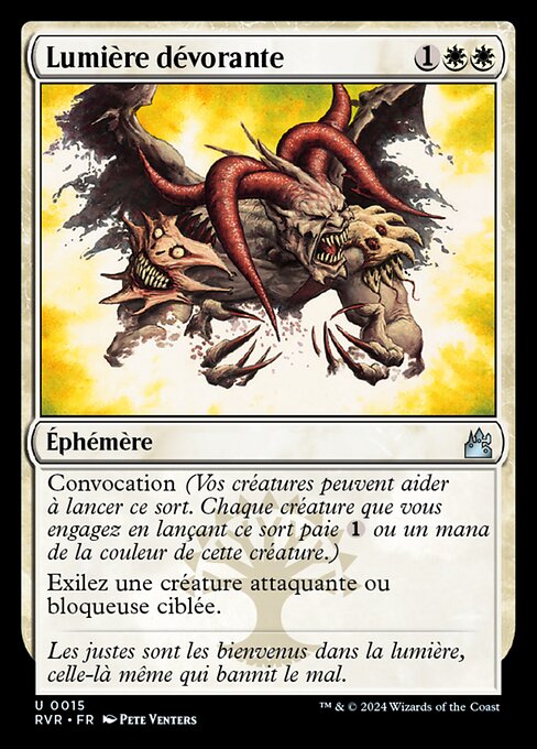 ![]() Variations— Parts— | Lumière dévoranteConvocation (Chaque créature que vous engagez en jouant ce sort réduit son coût de Retirez la créature attaquante ou bloqueuse ciblée de la partie.