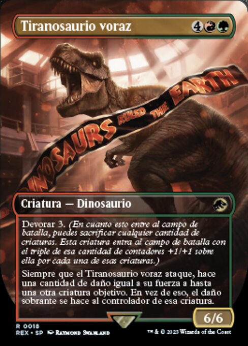每当血口霸王龙攻击时,它对至多另一个目标生物造成伤害,其数量等同于前者的力量。过量伤害改为对该生物的操控者造成之。