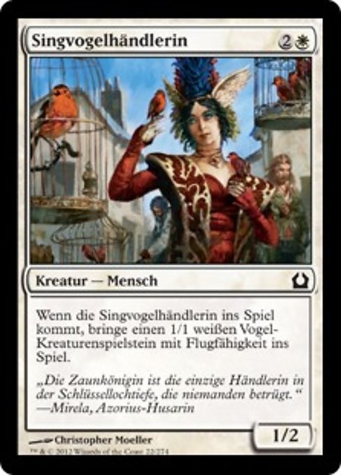 명금 상인이 전장에 들어올 때, 비행 능력을 가진 1/1 백색 조류 생물 토큰 한 개를 전장에 놓는다.