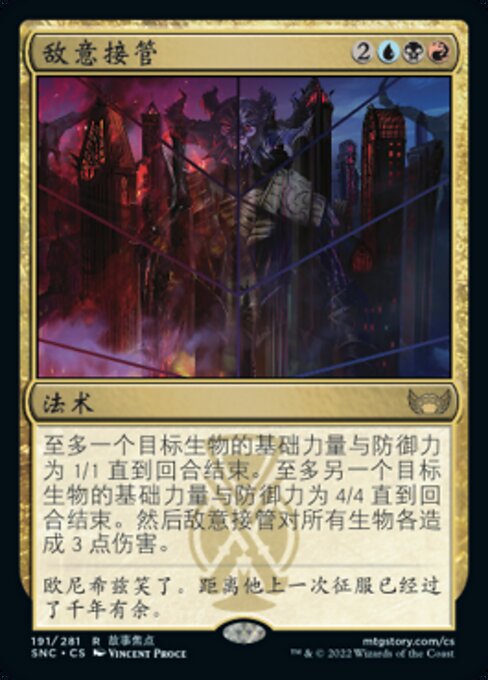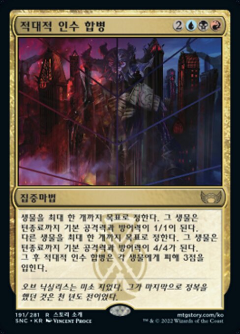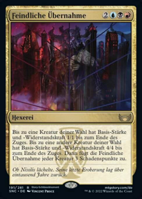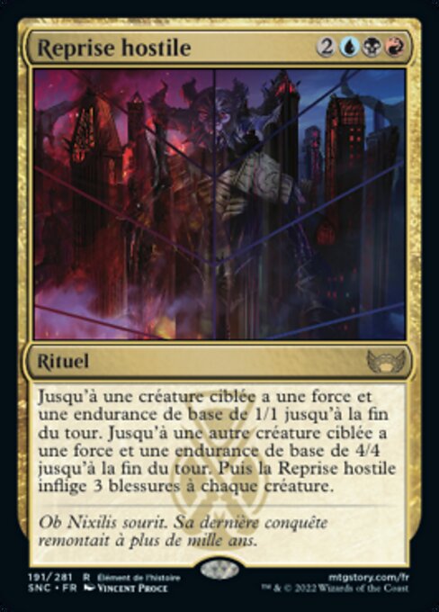 |  Variations : 2Parts— | Hostile TakeoverUp to one target creature has base power and toughness 1/1 until end of turn. Up to one other target creature has base power and toughness 4/4 until end of turn. Then Hostile Takeover deals 3 damage to each creature.